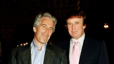 Portrait of American financier Jeffrey Epstein (left) and real estate developer Donald Trump as they pose together at the Mar-a-Lago estate, Palm Beach, Florida on February 22, 1997. (Photo by Davidoff Studios/Getty Images)