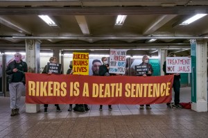 MANHATTAN, NEW YORK, UNITED STATES – 2023/04/03: Participants seen holding a banner at the protest. Members of the activist group Rise and Resist gathered at the weekly Close Rikers Vigil event held at the Shuttle concourse in the Times Square Subway Station. (Photo by Erik McGregor/LightRocket via Getty Images)