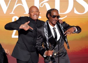 LOS ANGELES, CALIFORNIA – JUNE 09: (L-R) Dr. Dre presents Snoop Dogg with the Ultimate Icon Award onstage during the 2025 BET Awards at Peacock Theater on June 09, 2025 in Los Angeles, California. (Photo by Kevin Winter/Getty Images)