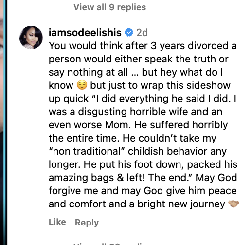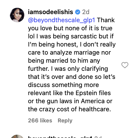 Deelishis then responded, reminding the user that she was being sarcastic. “Thank you love but none of it is true lol I was being sarcastic but if I’m being honest, I don’t really care to analyze marriage nor being married to him any further. I was only clarifying that it’s over and done so let’s discuss something more relevant like the Epstein files or the gun laws in America or the crazy cost of healthcare.”