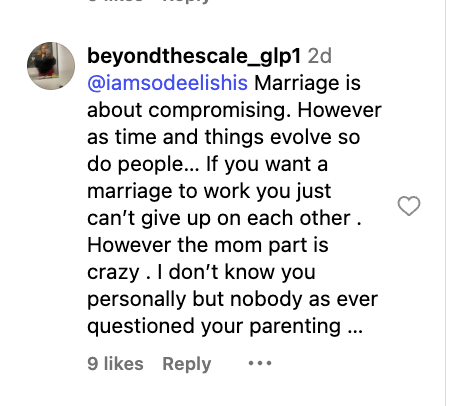 An Instagram user replied to the reality star’s comment suggesting her that they shouldn’t have given up their union. “Marriage is about compromising. However as time and things evolve so do people… If you want a marriage to work you just can’t give up on each other.”
