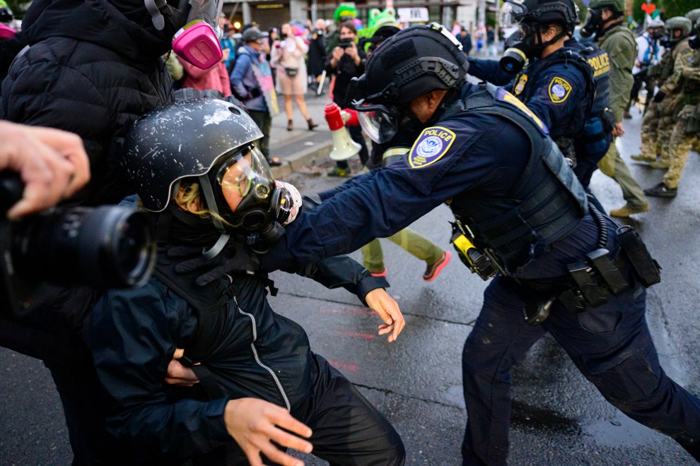 PORTLAND, OREGON – OCTOBER 12: Federal agents clash with anti-I.C.E. protesters at the U.S. Immigration and Customs Enforcement building on October 12, 2025 in Portland, Oregon. An Instagram post from the WorldNakedBikeRidePortland account stated – “The emergency WNBR Portland is in response to the militarization of our peaceful city. Right now peaceful protesters are being brutalized as they do their best for our neighbors and cousins who are being kidnapped.” (Photo by Mathieu Lewis-Rolland/Getty Images)