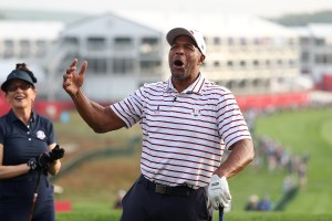 FARMINGDALE, NEW YORK – SEPTEMBER 24: Michael Strahan acknowledges the crowd on the first tee during the All-Star Match prior to the Ryder Cup 2025 at Black Course at Bethpage State Park Golf Course on September 24, 2025 in Farmingdale, New York. (Photo by Michael Reaves/PGA of America/PGA of America via Getty Images)