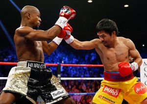 LAS VEGAS, NV – MAY 02: Manny Pacquiao throws a right at Floyd Mayweather Jr. during their welterweight unification championship bout on May 2, 2015 at MGM Grand Garden Arena in Las Vegas, Nevada. (Photo by Al Bello/Getty Images) (Photo by Al Bello/Getty Images)