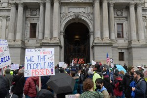 Protesters gather outside of the ICE Field office in Philadelphia, Pennsylvania during a protest against ICE and the killing of Renee Good on Saturday, January 10, 2025. A US Immigration and Customs Enforcement (ICE) agent shot and killed an American woman on the streets of Minneapolis January 7, leading to huge protests and outrage from local leaders who rejected White House claims she was a domestic terrorist. The woman, identified in local media as 37-year-old Renee Nicole Good, was hit at point blank range as she apparently tried to drive away from agents who were crowding around her car, which they said was blocking their way. (Photo by Matthew HATCHER / AFP via Getty Images)